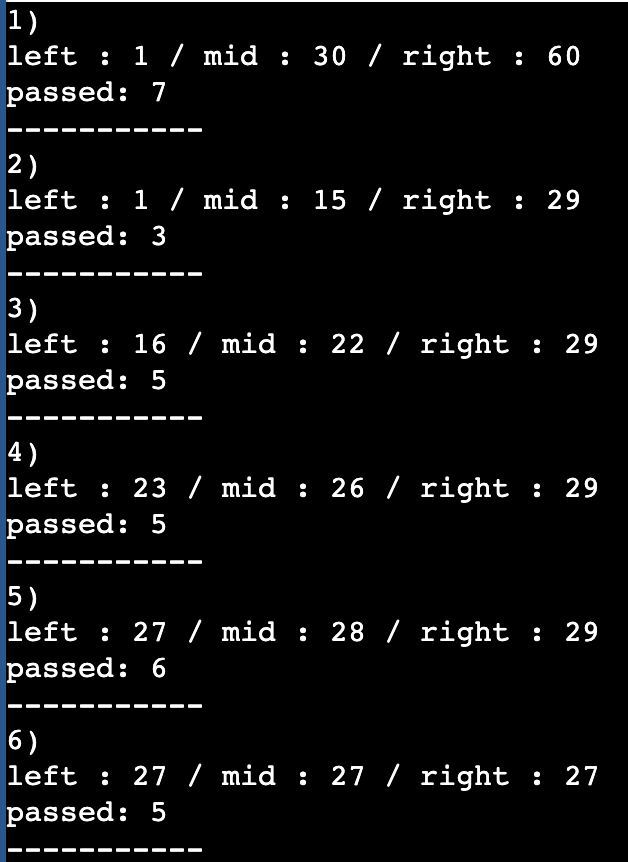 ㄴ예제의 테스트 케이스가 매개변수로 주어졌을 때 이진탐색 과정